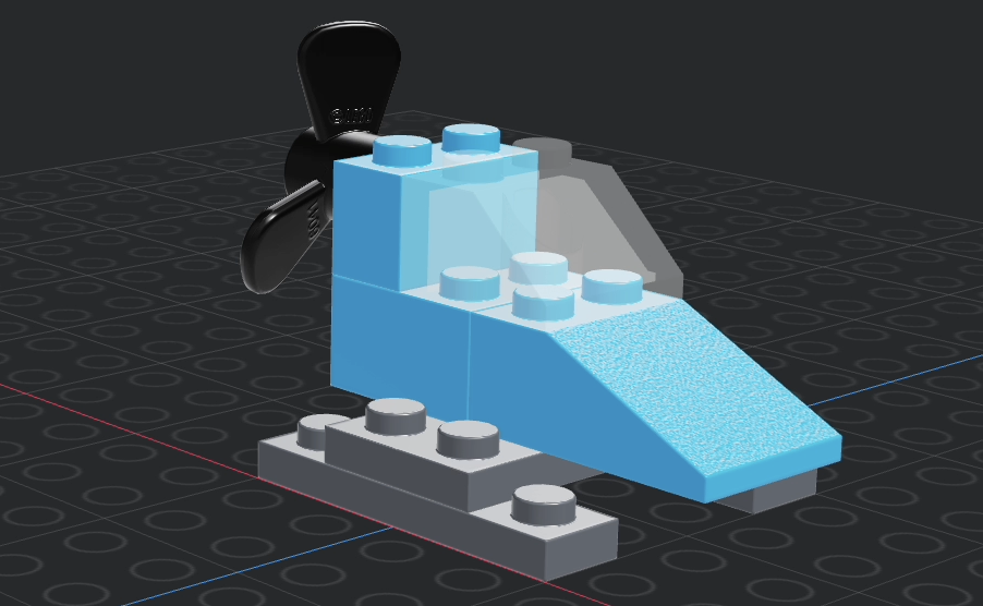 Use the skills you have learned so far to add a propeller (found in the transportation – boats category – part 6041), change it to a solid colour and put it on the back so that is over the shaft of the special brick.