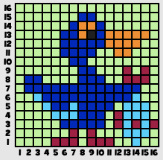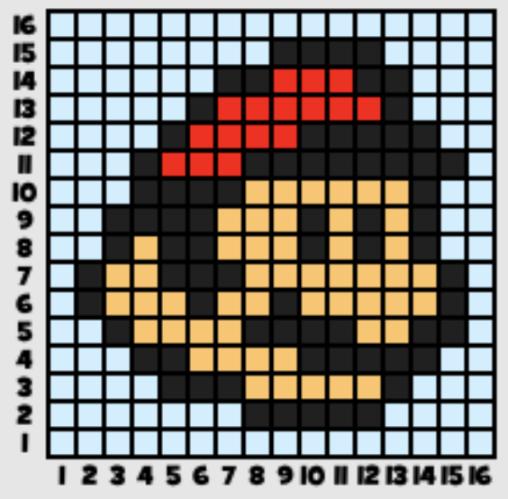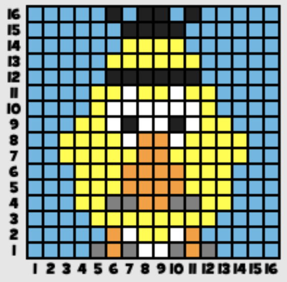 Click play below to try a mosaic with more pixels. Start with row 16 at the top and move downwards or row 1 and move upwards doing one row at a time.