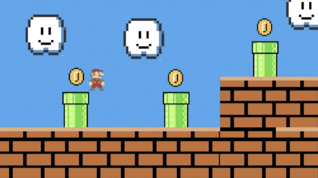 Watch the video to learn how to create your game background using stamps and copy/paste. Do not add your player graphic yet (Mario).
