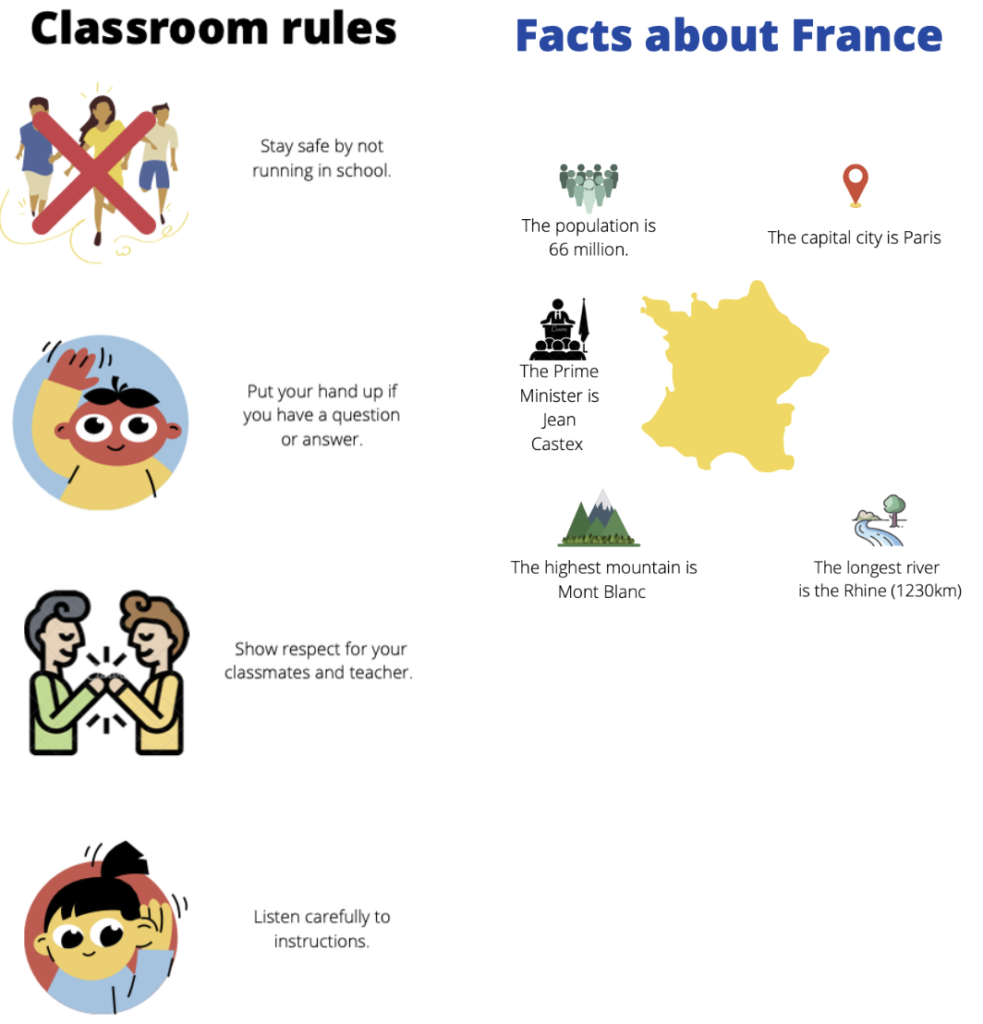 Watch the video tutorial to learn how to add graphical elements to your infographic. You can try making a classroom/school rules infographic like the one below or a facts about a country or place.